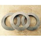 獨(dú)特的墊圈內(nèi)側(cè)斜齒面傾斜角度 α 大于螺栓螺紋傾斜角度 β 。 裝配時(shí), 內(nèi)側(cè)斜齒面是相對(duì)的, 墊圈外側(cè)放射狀的凸紋面 (外滾花齒面) 的摩擦系數(shù)要比內(nèi)側(cè)斜齒面 的摩擦系數(shù)大, 且與兩端接觸面成咬合狀態(tài)。 當(dāng)連接件受到振動(dòng), 并使螺栓發(fā)生松動(dòng)趨勢(shì)時(shí), 僅僅允許兩片墊圈內(nèi)側(cè)斜齒間相對(duì)抬升錯(cuò)動(dòng), 產(chǎn)生擡升張力。 獨(dú)特的齒牙系統(tǒng)利用張力在緊固的 連接處產(chǎn)生壹個(gè)很高的抵抗力來(lái)經(jīng)受振動(dòng)力,從而達(dá)到 100% 的防松效果。