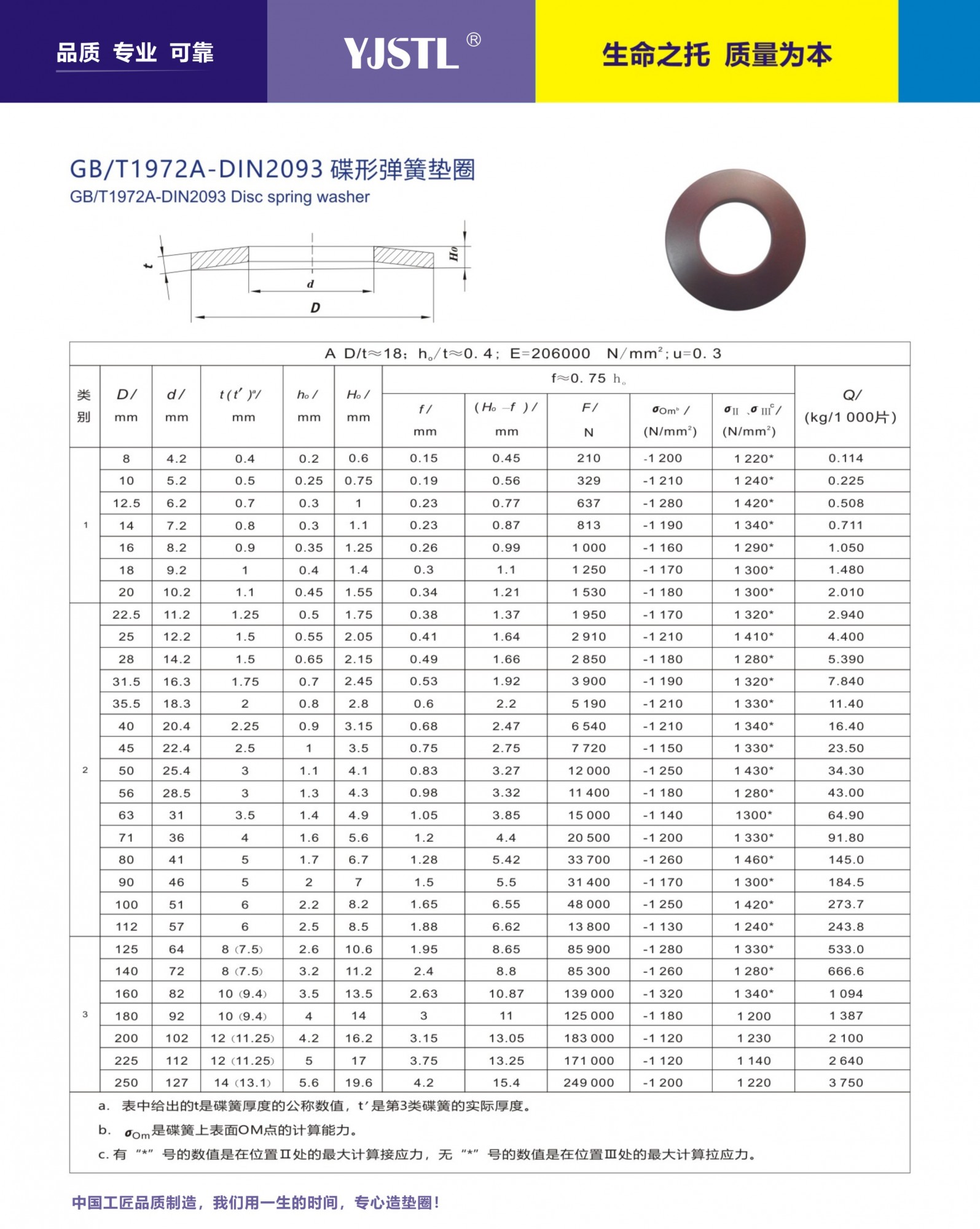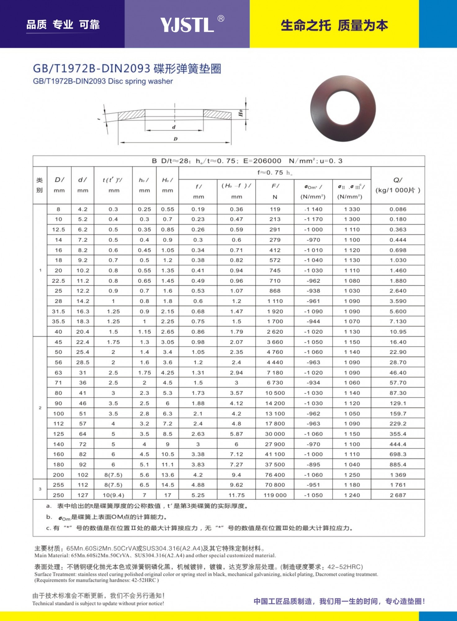 制造執(zhí)行標(biāo)準(zhǔn):國(guó)標(biāo)GB1972ABC引用DIN2093(ABC系)。規(guī)格:M-M127 也能根據(jù)客戶(hù)需求提供訂制,主要材質(zhì)有65MN,60Si2mn,51crav4及特殊合金材質(zhì),鹽浴硬化,表面處理為磷化黑,機(jī)械鋅,達(dá)克羅涂層等!不提供化學(xué)電鍍處理!多數(shù)情況下標(biāo)準(zhǔn)型碟形彈簧墊圈并不能完全滿(mǎn)足用戶(hù)要求,通過(guò)計(jì)算與適當(dāng)調(diào)整來(lái)獲得理想的訂制功能!