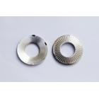 DIN6795是德國標準、該墊圈是一款法式鎖緊墊圈的改良設(shè)計產(chǎn)品、表面條紋有預(yù)緊防松作用。墊圈的背面設(shè)計有六個爪形剌破角!主要功能是在配合螺栓螺釘擰緊時可以剌破金屬基體表面!主要功能是剌破作用、因此也有人叫剌破墊圈、帶爪觸地墊圈!