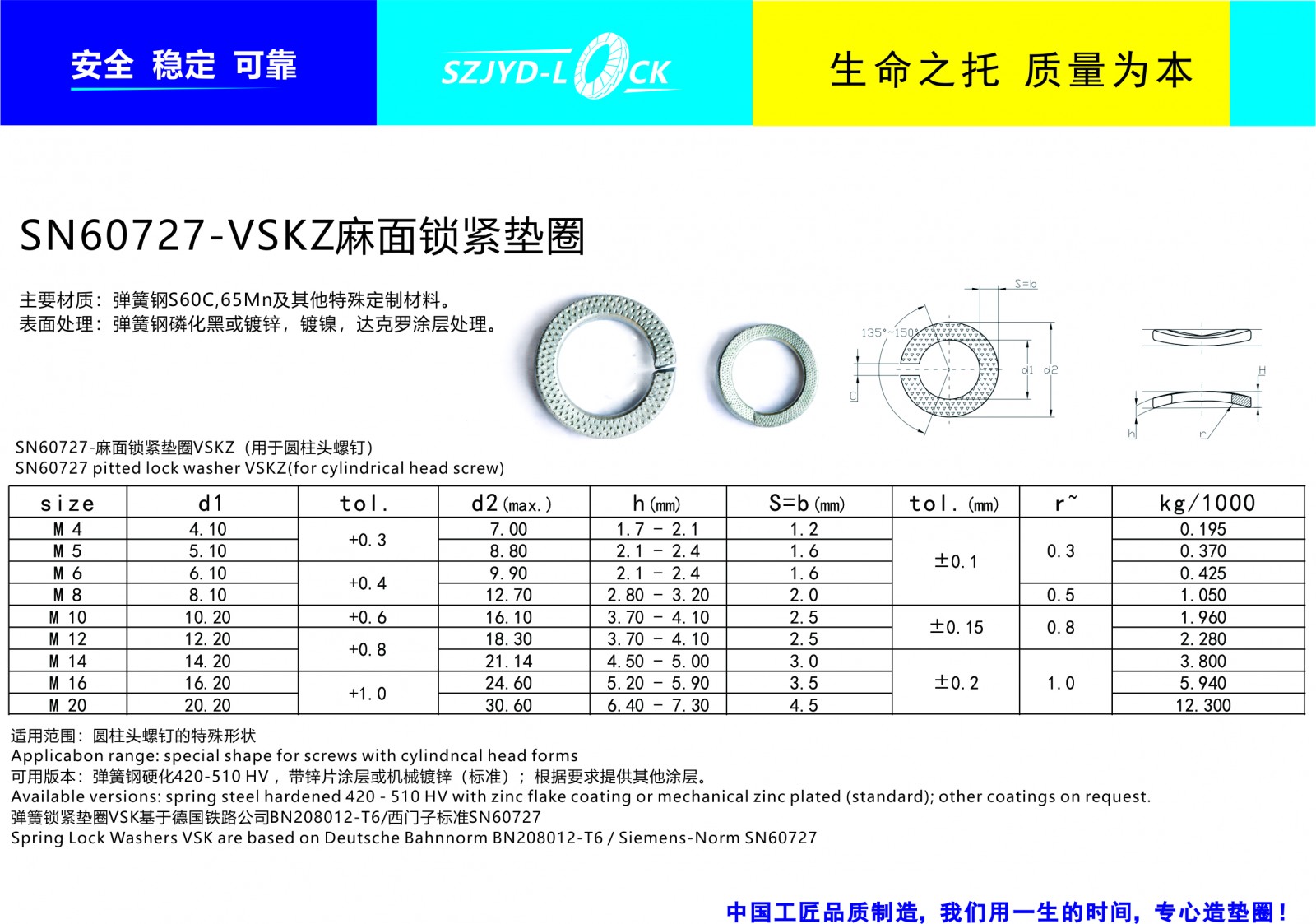 SN60727-VSKZ 麻面墊圈由西門子軌道交通公司設(shè)計(jì)制定、基于張力摩擦的構(gòu)造原理。鞍形墊圈表面麻面花紋與螺栓鎖緊面接觸,增大的鎖緊力起到了明顯防松功能!VSKZ標(biāo)準(zhǔn)窄型麻面墊圈適用于較小安裝空間!