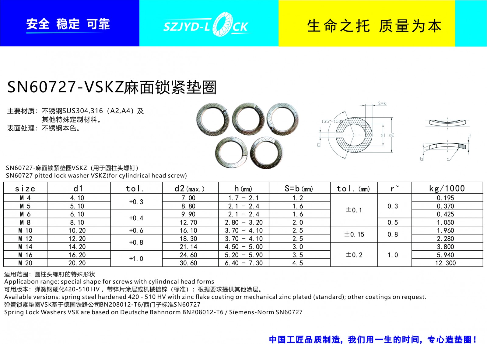 SN60727-VSKZ不銹鋼麻面墊圈由西門子軌道交通公司設(shè)計(jì)制定、基于張力摩擦的構(gòu)造原理。鞍形墊圈表面麻面花紋與螺栓鎖緊面接觸,增大的鎖緊力起到了明顯防松功能!VSKZ標(biāo)準(zhǔn)窄型麻面墊圈適用于較小安裝空間!